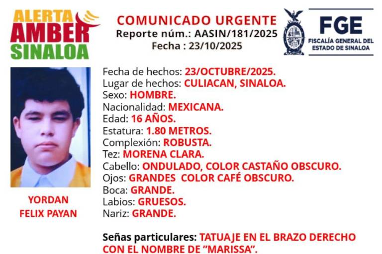 CULIACÁN. _ La Fiscalía General del Estado de Sinaloa (FGE) activó la Alerta Amber para localizar a Yordan Félix Payán, de 16 años de edad, quien se encuentra desaparecido desde el pasado miércoles 23 de octubre de 2025 en esta ciudad.