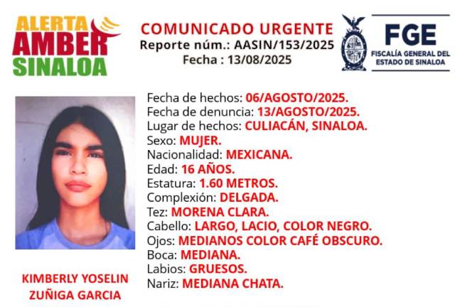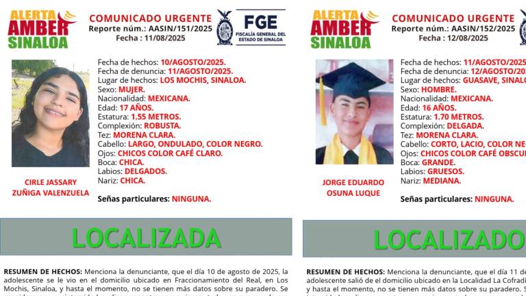 En ambos casos, las autoridades consideran que la integridad de las menores pudiera encontrarse en riesgo, ya que podrían ser víctimas de la comisión de un delito. Se solicita a la ciudadanía cualquier información que pueda ayudar a dar con su paradero, comunicándose a los teléfonos de la Alerta Amber Sinaloa: 800 8-90-90-92 y 667 7-16-70-90.