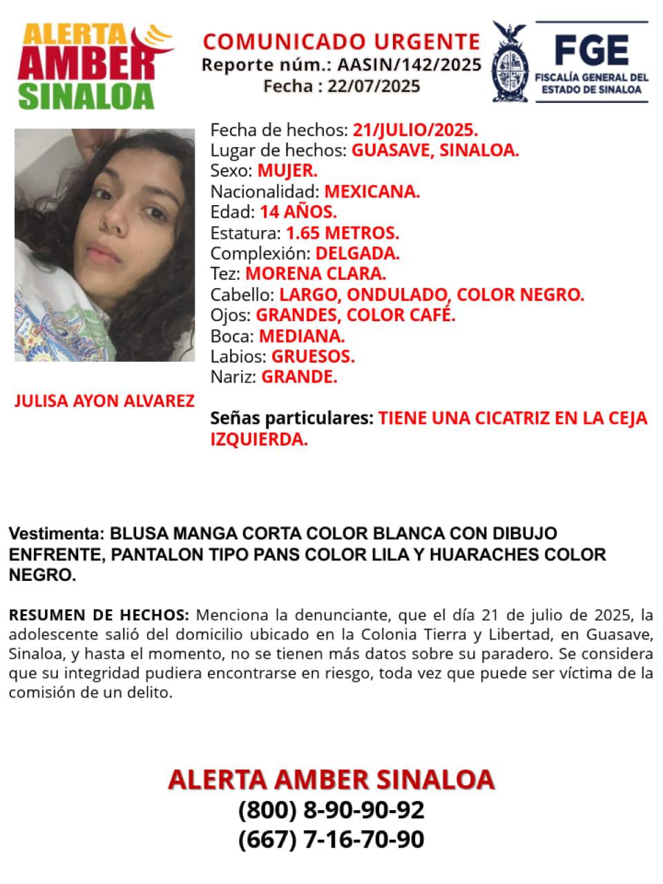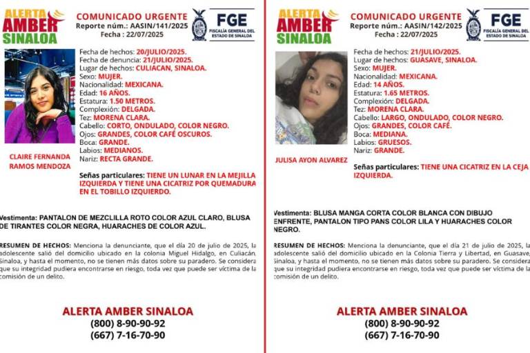 CULIACÁN. _ La Fiscalía General del Estado de Sinaloa emitió dos alertas Amber para localizar a Claire Fernanda “N”, de 16 años, y Julisa “N”, de 14, quienes desaparecieron en distintos municipios de la entidad entre el 20 y el 21 de julio de 2025.