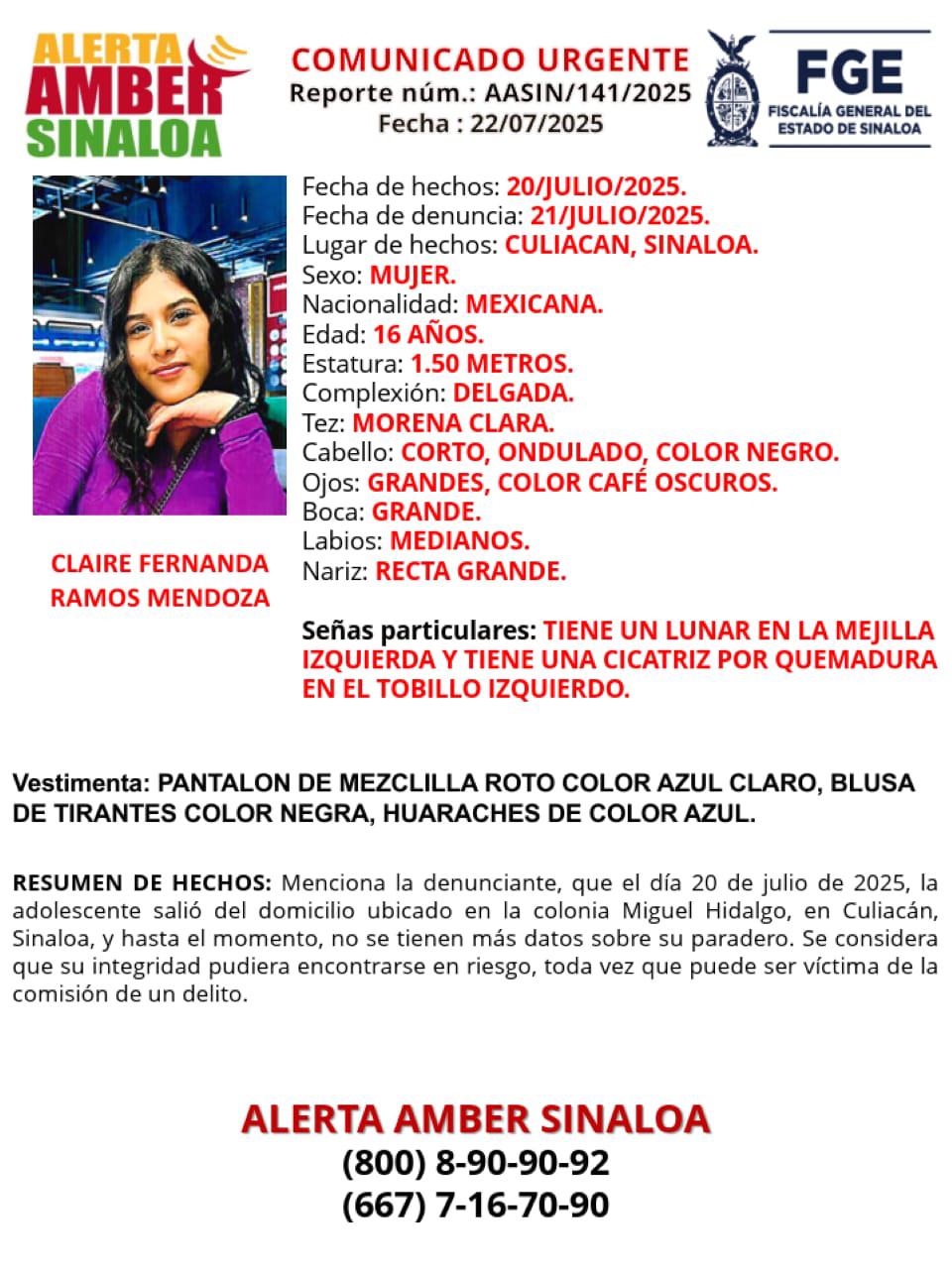 Claire Fernanda fue vista por última vez el 20 de julio, cuando salió de su domicilio en la colonia Miguel Hidalgo, en Culiacán. Según el reporte, la joven vestía un pantalón de mezclilla azul claro roto, blusa negra de tirantes y huaraches del mismo tono. Tiene como señas particulares un lunar en la mejilla izquierda y una cicatriz en el tobillo izquierdo, producto de una quemadura.
