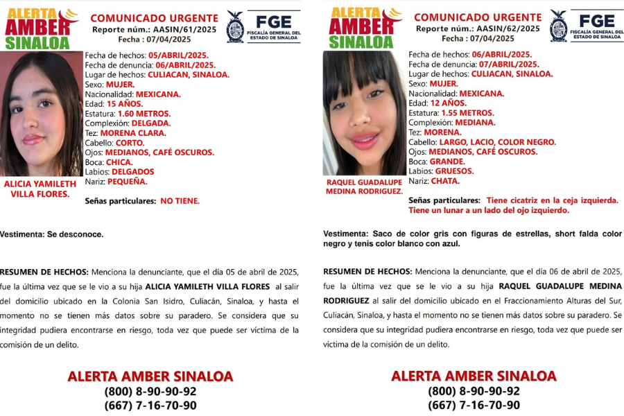 La FGE solicita el apoyo de la ciudadanía para proporcionar cualquier información que ayude a localizar a las menores, poniendo a disposición los teléfonos del programa Alerta Amber Sinaloa 800 8-90-90-92 y 667 7-16-70-90.