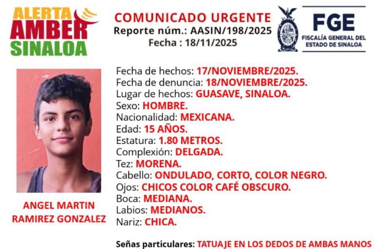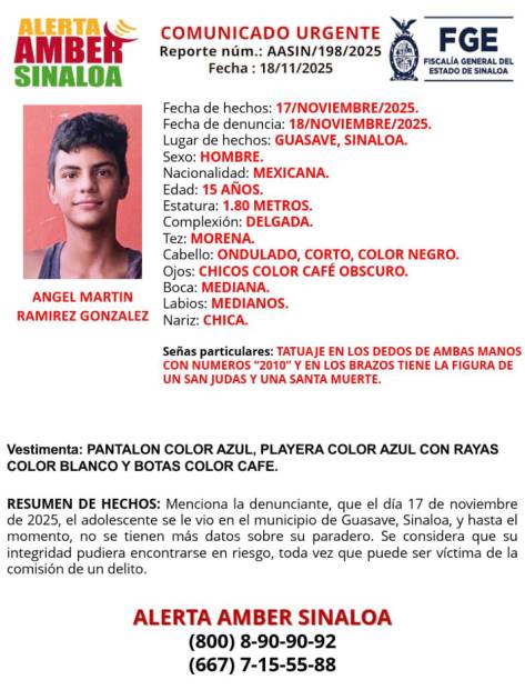 La Fiscalía General del Estado de Sinaloa (FGE) activó la Alerta Amber para la de Ángel Martin Ramírez González, un adolescente de 15 años que se encuentra desaparecido desde el pasado 17 de noviembre de 2025.
