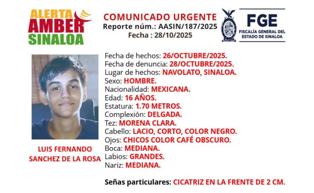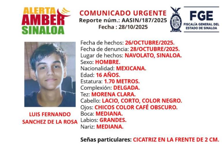 NAVOLATO. _ Autoridades estatales activaron la Alerta Amber tras la denuncia de la desaparición de Luis Fernando Sánchez de la Rosa, un adolescente de 16 años de edad, en el municipio de Navolato.