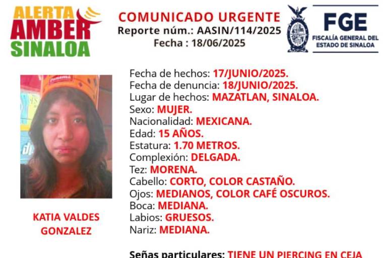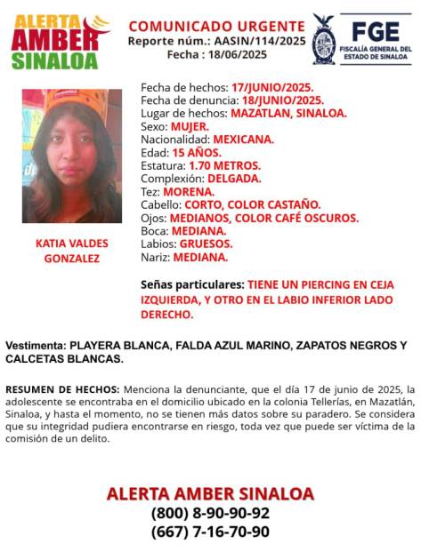 MAZATLÁN. _ La Fiscalía General del Estado de Sinaloa activó una Alerta Amber para la localización de Katia “N”, una adolescente de 15 años de edad, quien fue reportada como desaparecida desde el pasado 17 de junio en el municipio de Mazatlán.