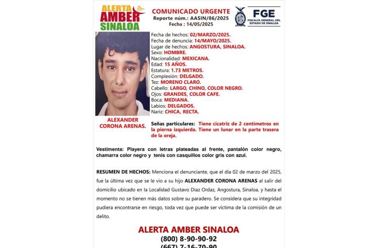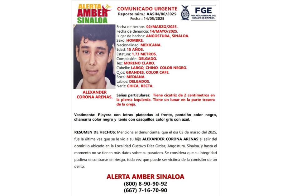 La Fiscalía General del Estado de Sinaloa activó una Alerta Amber para localizar a Alexander Corona Arenas, un adolescente de 15 años que fue reportado como desaparecido desde el pasado 2 de marzo en Angostura.