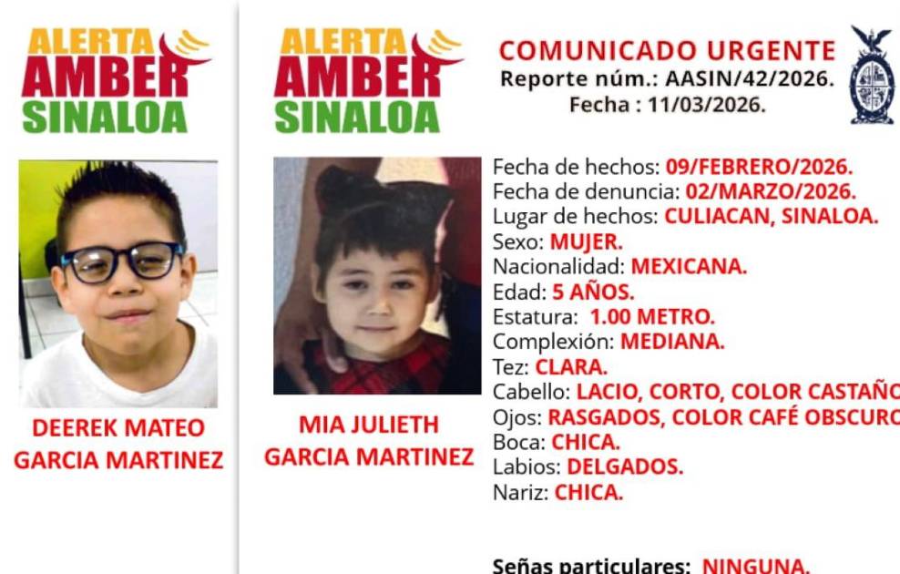 Se trata de Mía Julieth García Martínez, de 5 años de edad, y Deerek Mateo García Martínez, de 8 años, quienes fueron vistos por última vez el pasado 9 de febrero de 2026, cuando salieron en compañía de su madre de un domicilio ubicado en la Colonia Díaz Ordaz.