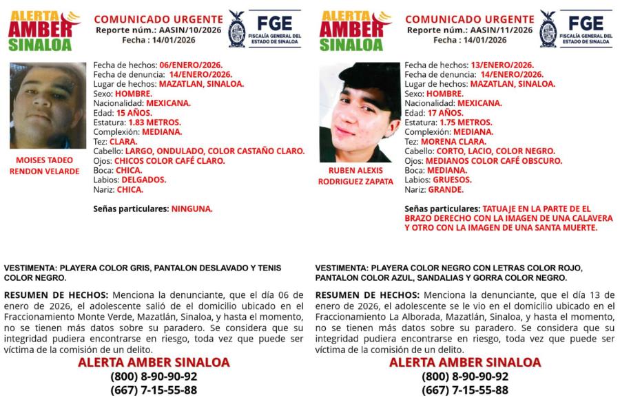 La Fiscalía General del Estado de Sinaloa (FGE) emitió dos fichas de búsqueda bajo el protocolo Alerta Amber, tras la desaparición de dos adolescentes en hechos distintos ocurridos en el puerto de Mazatlán durante el mes de enero.
