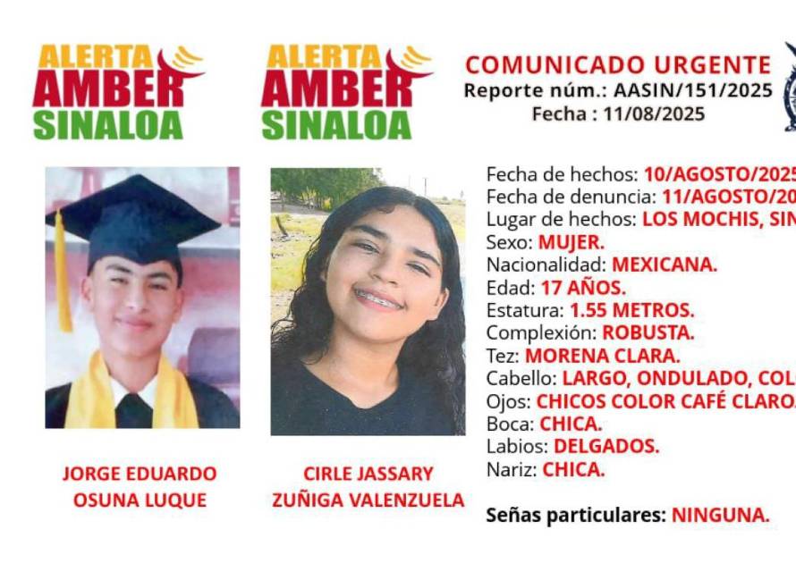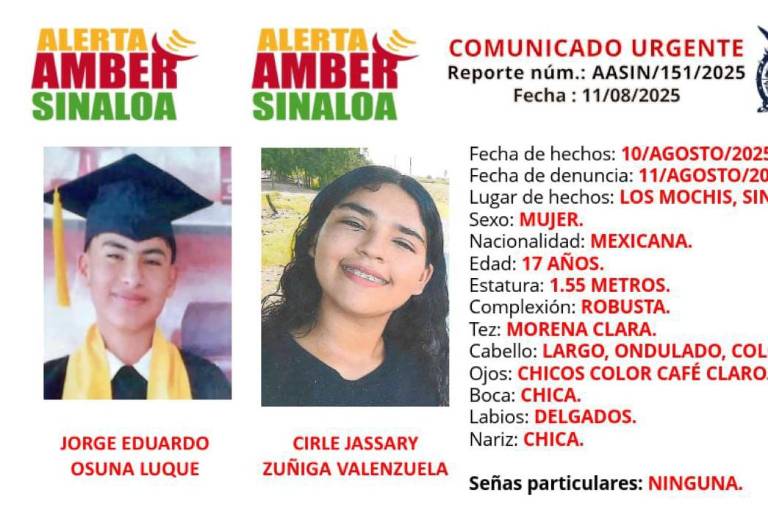 CULIACÁN._ La Fiscalía General del Estado (FGE) activó la Alerta Amber para localizar a dos jóvenes que desaparecieron en Los Mochis y Guasave.