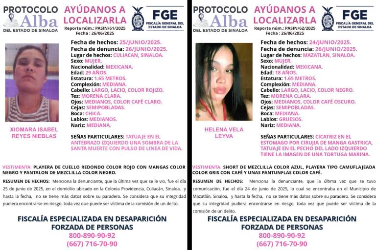 CULIACÁN._ La Fiscalía General del Estado de Sinaloa emitió dos reportes del Protocolo Alba para solicitar el apoyo ciudadano en la localización de Xiomara Isabel, de 29 años; y Helena, de 18, quienes fueron vistas por última vez en diferentes municipios de la entidad.