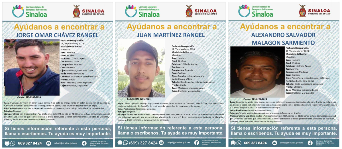 Según el relato de hechos, los tres empleados se comunicaron por última vez ese día a las 21:30 horas desde el crucero carretero a la altura del poblado de El Llorón, sobre la carretera Libre Mazatlán-Culiacán, y desde entonces se desconoce su paradero.