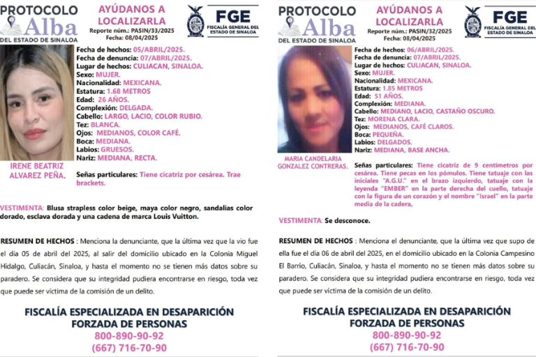 CULIACÁN. _ La Fiscalía General del Estado de Sinaloa ha activado el Protocolo Alba tras la desaparición de dos mujeres en distintos puntos de la ciudad de Culiacán. Los reportes fueron emitidos con apenas un día de diferencia, y las autoridades temen que ambas puedan estar en situación de riesgo.