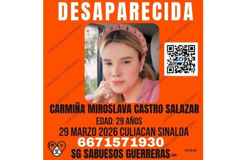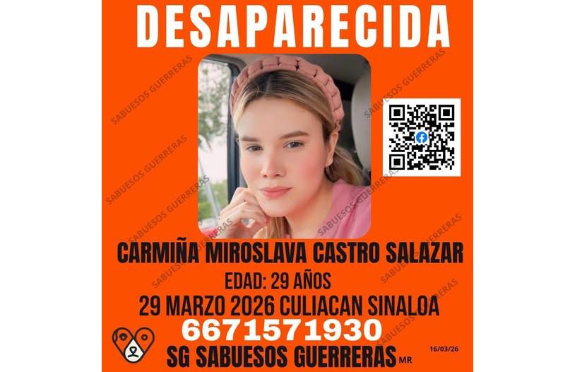La Fiscalía General del Estado de Sinaloa activó el Protocolo Alba para localizar a Carmina Miroslava Castro Salazar, de 29 años de edad, reportada como desaparecida el 29 de marzo de 2026 en Culiacán.