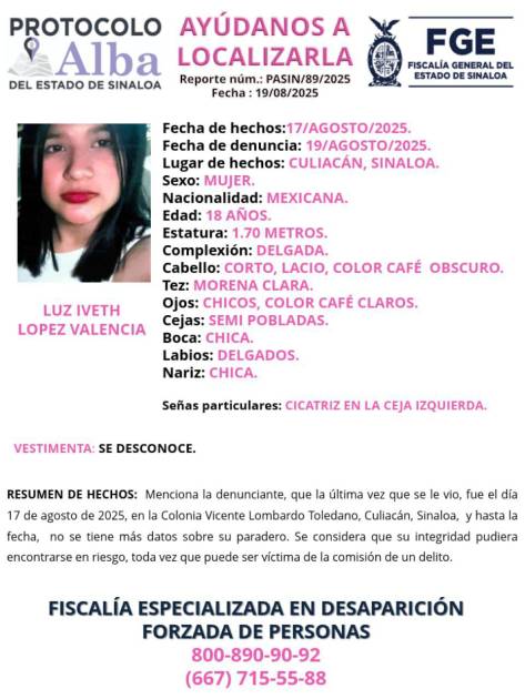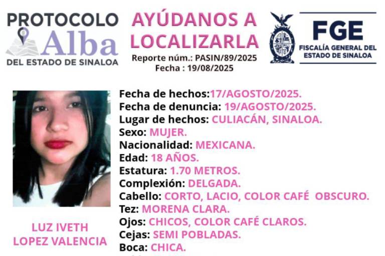 CULIACÁN. _ La Fiscalía General del Estado de Sinaloa activó el Protocolo Alba para la búsqueda de Luz Iveth López Valencia, de 18 años, quien fue reportada como desaparecida en la capital sinaloense.