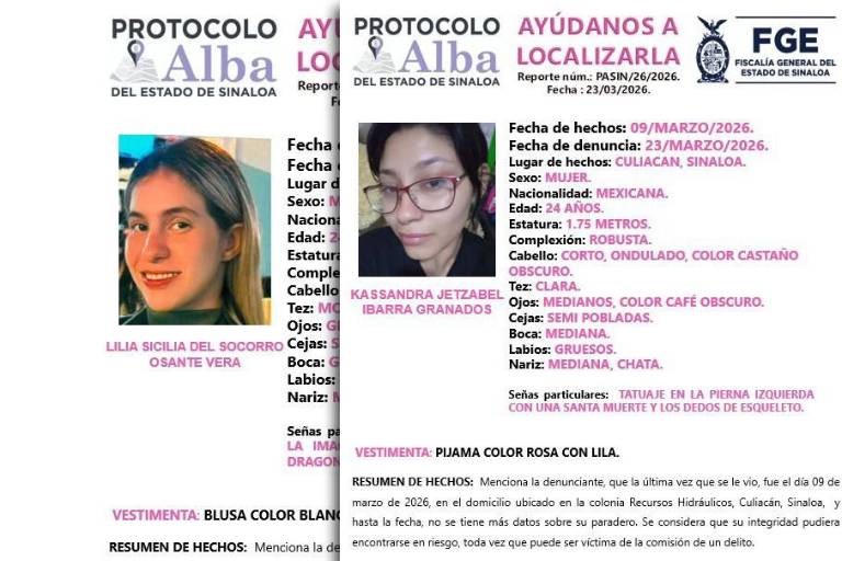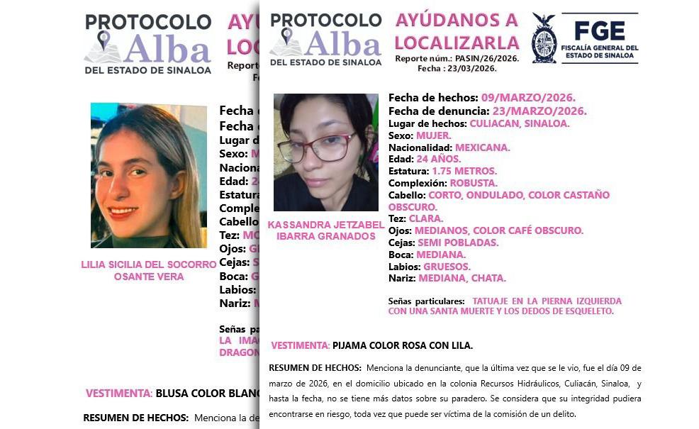 La Fiscalía General del Estado activó el Protocolo Alba para la búsqueda de dos mujeres reportadas como desaparecidas en los municipios de Culiacán y Mazatlán.