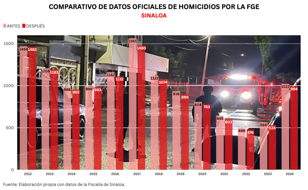 De acuerdo con los datos anteriores, de 2012 a 2024 ocurrieron en Sinaloa 12 mil 983 homicidios, pero con la última actualización, esa cifra acumulada se redujo a 12 mil 544 homicidios, lo que significa una diferencia de 439 decesos que representan el 3.4 por ciento del total.