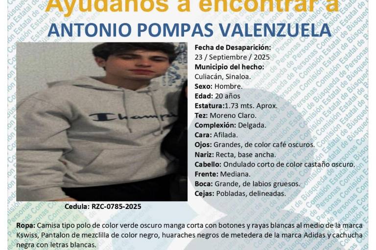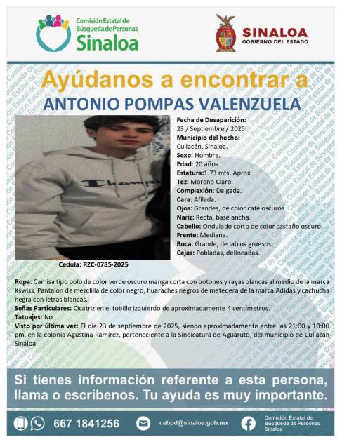 CULIACÁN. _ La Comisión Estatal de Búsqueda de Personas de Sinaloa emitió una ficha de búsqueda para localizar a Antonio Pompas Valenzuela, un joven de 20 años que fue visto por última vez el 23 de septiembre de 2025, en la colonia Agustina Ramírez, perteneciente a la Sindicatura de Aguaruto, en el municipio de Culiacán, Sinaloa.
