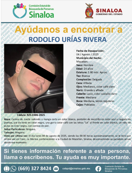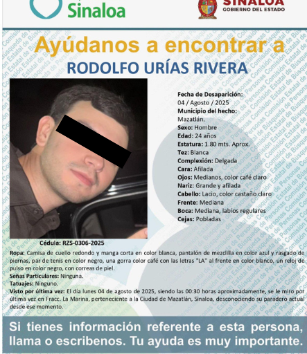 CULIACÁN. _ Rodolfo “N”, uno de los tres jóvenes que fueron reportados como privados de la libertad en Mazatlán, fue localizado con vida la madrugada de este miércoles, informaron sus familiares y la Fiscalía General del Estado de Sinaloa.