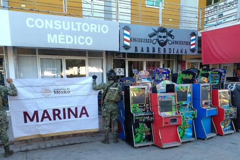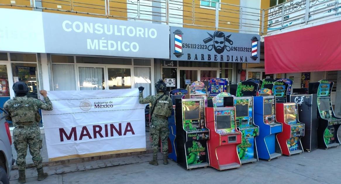 La Secretaría de Marina, en participación con la Armada de México, registró el aseguramiento de 46 máquinas tragamonedas, en la localidad de La Cruz de Elota.