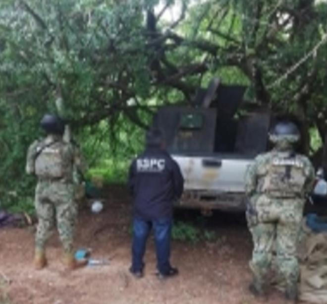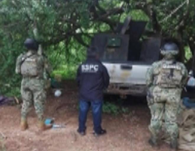 CONCORDIA. _ Un operativo terrestre de la Secretaría de Marina en zonas serranas del municipio de Concordia, Sinaloa, derivó en el aseguramiento de explosivos, cartuchos, cargadores, droga y vehículos con reporte de robo, uno de ellos modificado con blindaje artesanal.