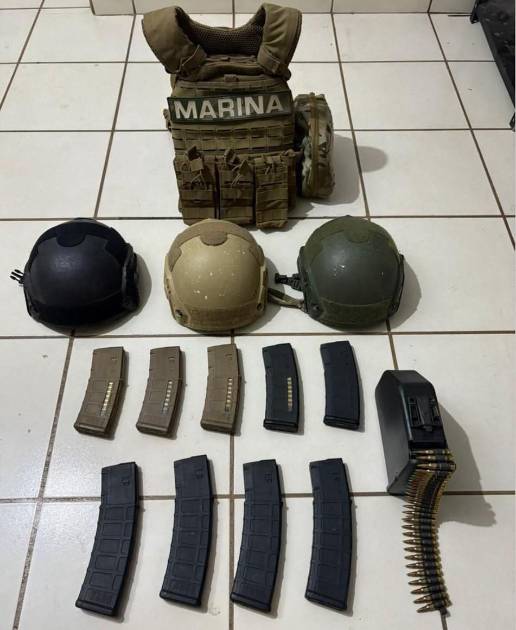 En el interior de la unidad, los agentes encontraron siete cargadores abastecidos para fusil, un cargador para cinta de ametralladora, un chaleco táctico con placas balísticas y tres cascos tipo kevlar.