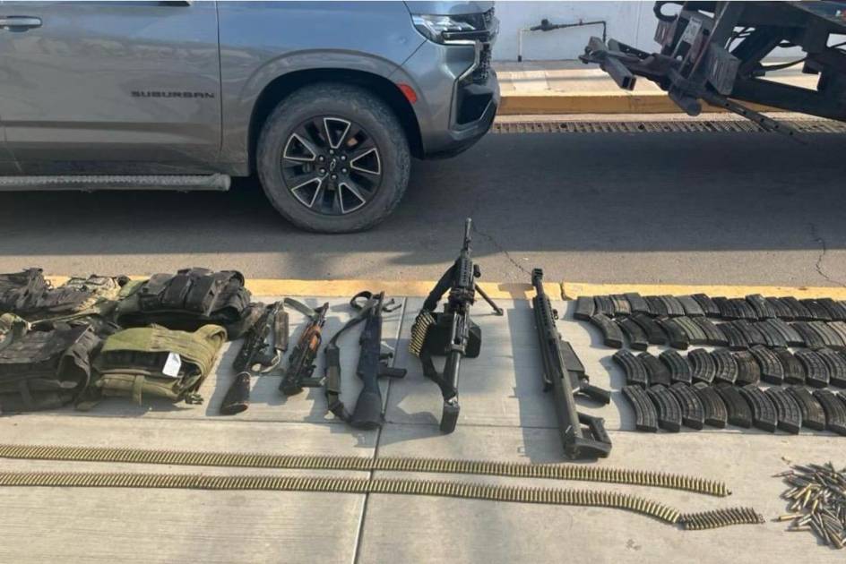 En el interior de las camionetas se aseguraron armas de alto poder, municiones y equipo táctico. El arsenal incautado incluye una ametralladora Minimi calibre 5.56x45 mm, un fusil Barret calibre .50, tres fusiles AK-47 calibre 7.62x39 mm, cargadores y municiones de diversos calibres, equipo táctico, suburban blindada con dispositivo hidráulico, y una camioneta Dodge RAM blanca con blindaje.