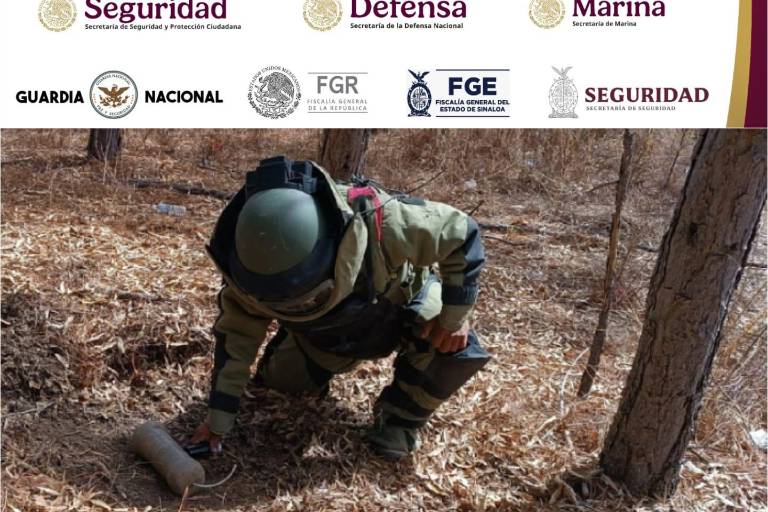 CULIACÁN._ Elementos del Ejército Mexicano aseguraron y destruyeron artefactos explosivos improvisados y granadas encontrados durante operativos de reconocimiento terrestre en Badiraguato.