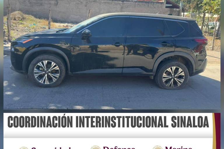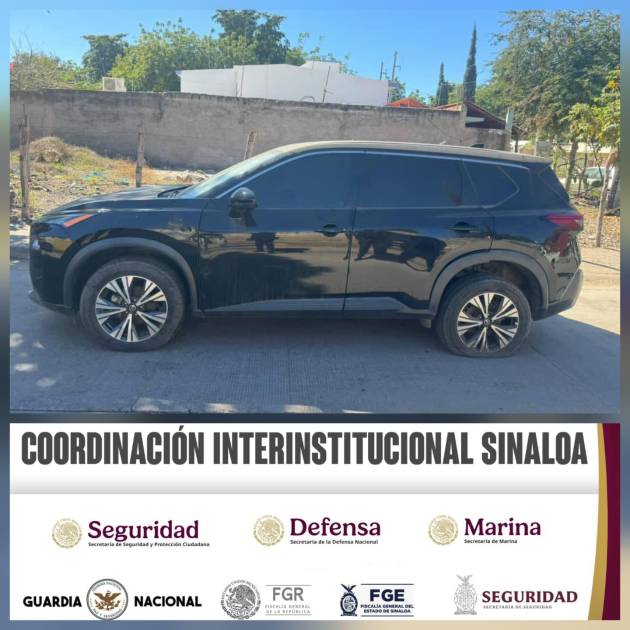 El automóvil asegurado es una camioneta tipo SUV Nissan Rogue, de color negro, con reporte de robo.