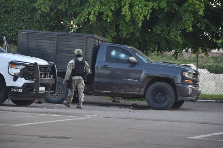 La camioneta de color azul marino con negro presenta impactos de bala.