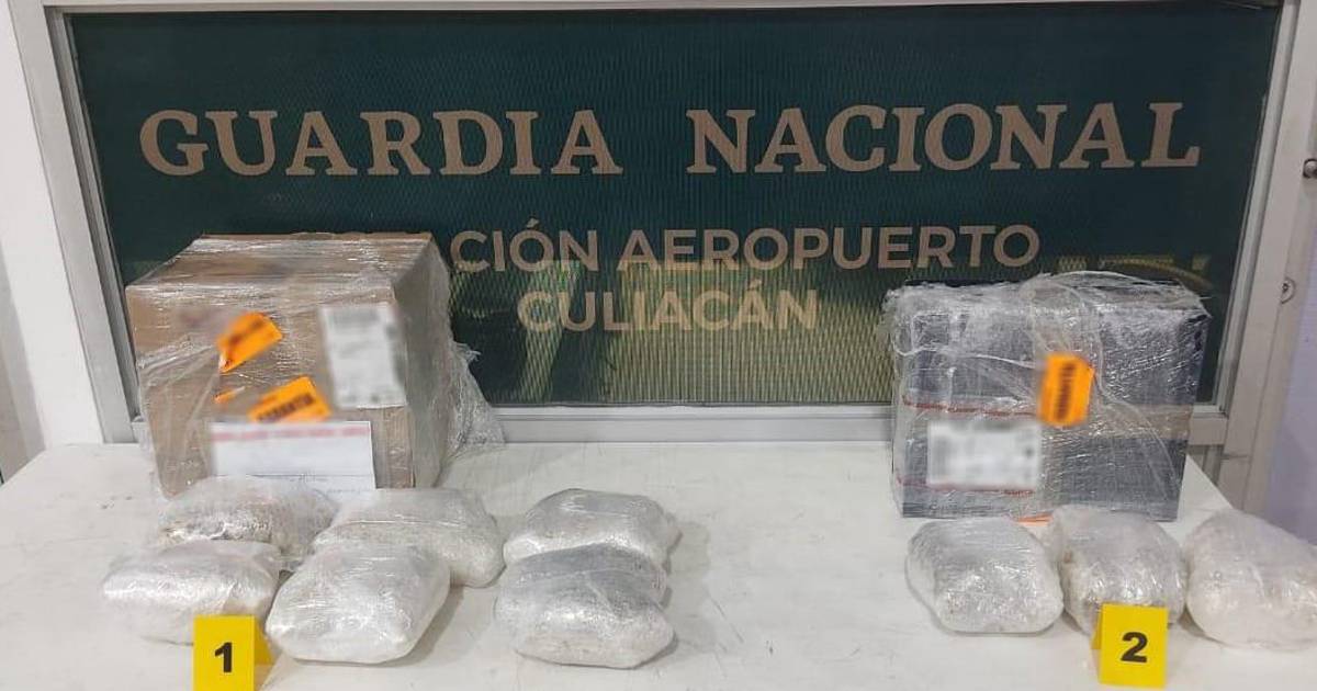 Un total de 171 paquetes con aparente droga sintética, ocultos en cajas que transportaban plafones de yeso, fueron asegurados por personal de la Guardia Nacional en el Aeropuerto de Culiacán.