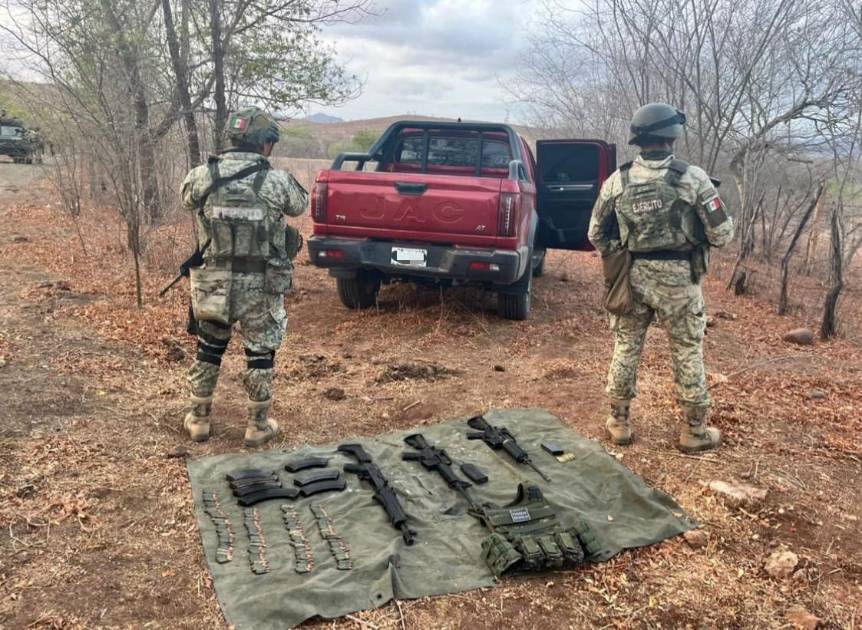 CULIACÁN. _ Durante recorridos de reconocimiento terrestre en el poblado El Salado, municipio de Culiacán, elementos del Ejército Mexicano localizó una camioneta de la marca Jac, y en su interior, tres armas largas, nueve cargadores para armas largas, 210 cartuchos de diferentes calibres y un chaleco balístico.
