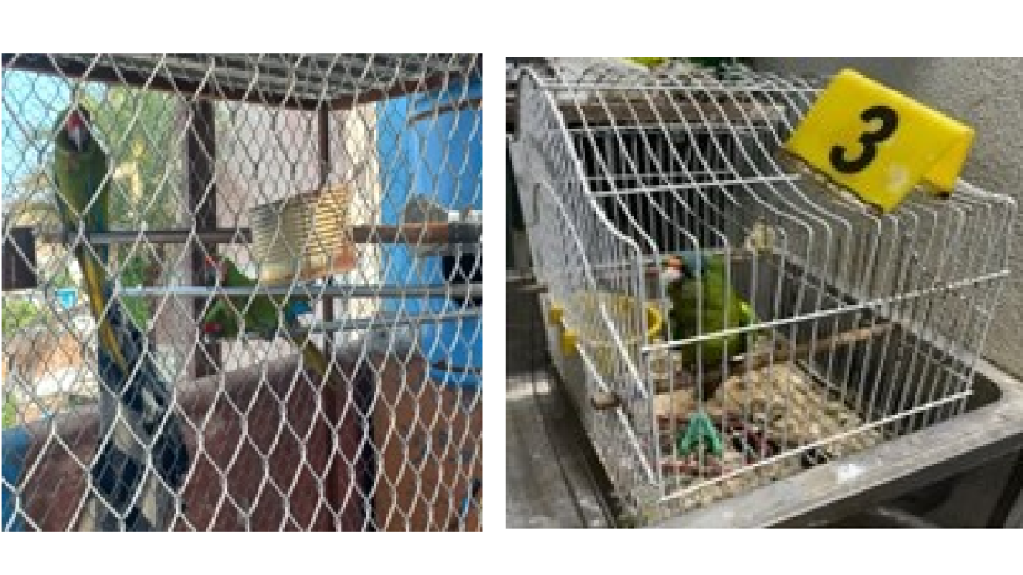En el lugar se aseguraron tres guacamayas, dos pericos y una iguana.