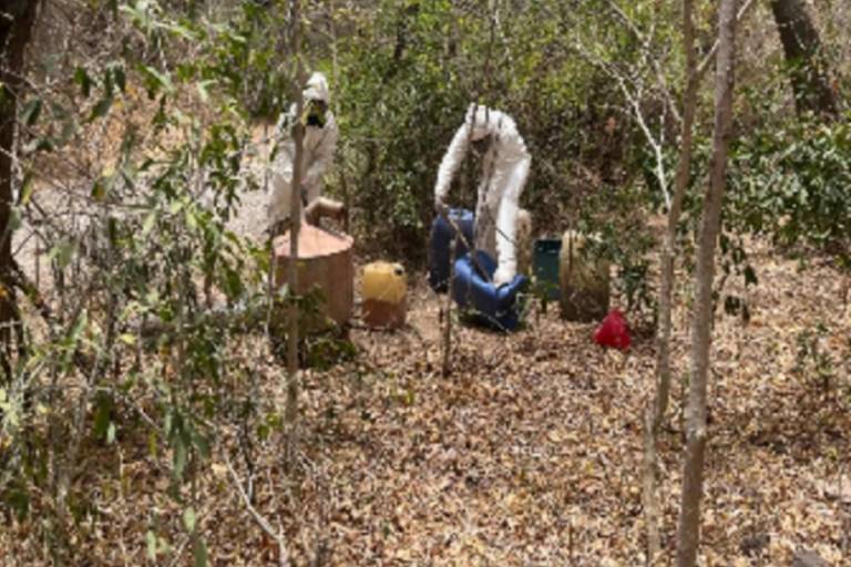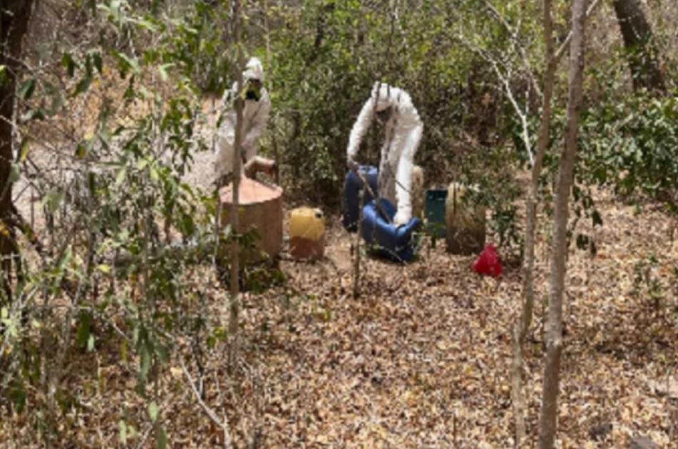 De acuerdo con la información, en una primera acción los efectivos castrenses localizaron un laboratorio para la elaboración de drogas, el cual al parecer se encontraba inactivo, así como tres áreas de concentración donde se almacenaban sustancias químicas, en donde aseguraron 142.5 lts. de acetona, 40 lts. de alcohol etílico, 10 lts. de ácido clorhídrico, 15 lts. de aceite crudo, cinco bidones, seis tambos, nueve tinacos y una olla de peltre.