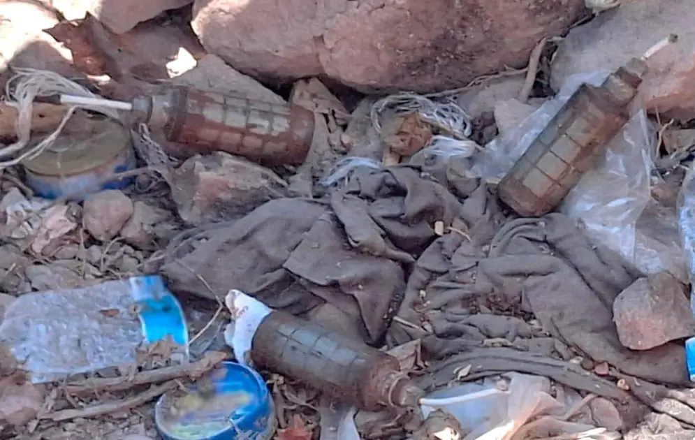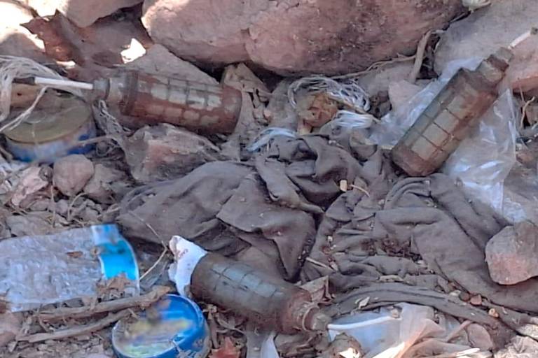 En las imágenes difundidas por las autoridades, se observa que los artefactos se encontraban sobre terracería, rodeados de prendas de vestir y residuos de alimentos enlatados.