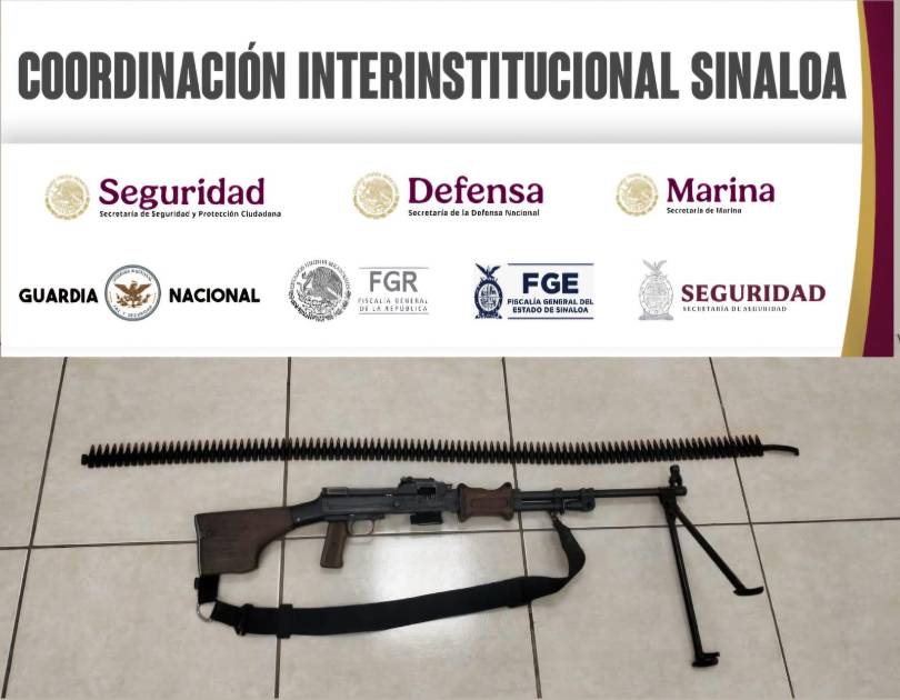 CULIACÁN._ Una ametralladora y una cinta con cartuchos fueron asegurados por elementos de la Guardia Nacional tras recorridos preventivos realizados en la sindicatura de Aguaruto, al poniente de Culiacán.