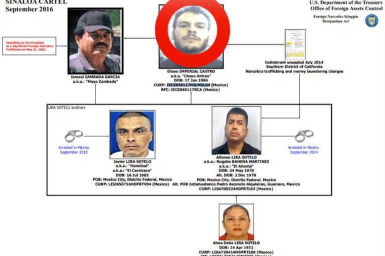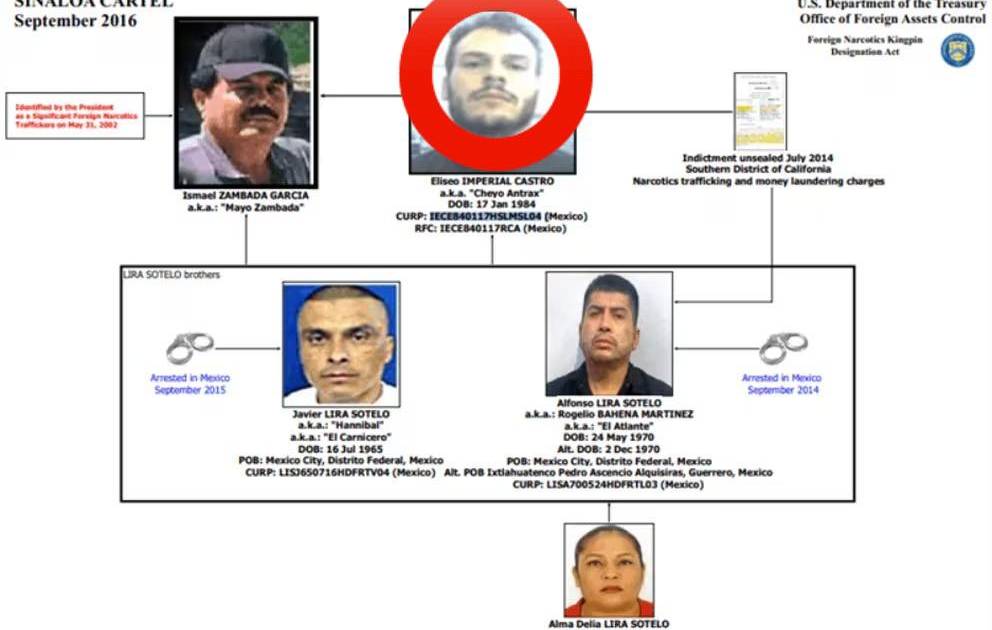 En 2016, la Oficina para el Control de Activos Extranjeros, que depende del Departamento del Tesoro de los Estados Unidos, identificó a Eliseo Imperial Castro como cabecilla del grupo criminal Los Ántrax. Ese mismo año el tribunal federal del sur de California formuló cargos contra Eliseo Imperial Castro por traficar metanfetaminas, cocaína, marihuana y lavar dinero.