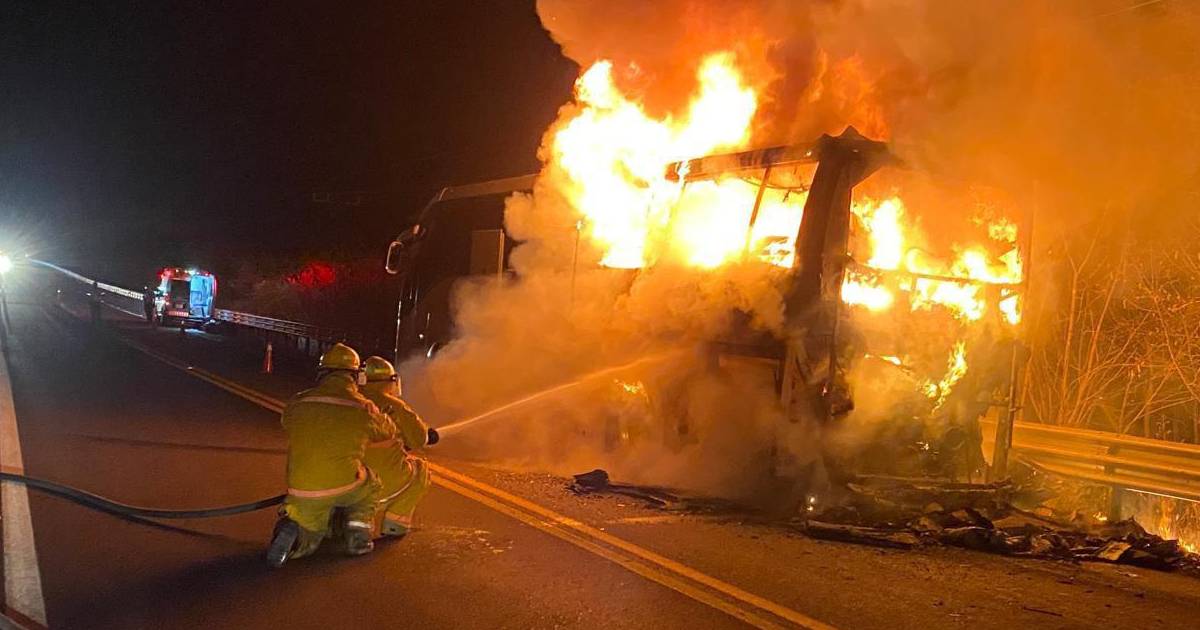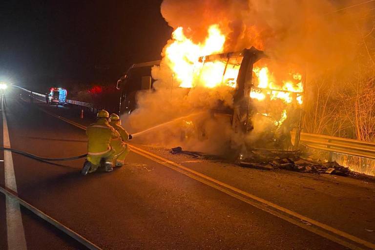 Un autobús se incendió en la Autopista Mazatlán-Durango, antes de llegar a la caseta de cobro de Mesillas por la noche del viernes; el hecho obligó a cerrar la carretera cerca de 8 horas.