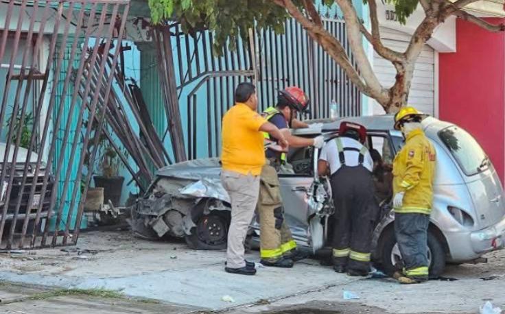 Al parecer, el conductor de un automóvil Chrysler PT Cruiser, que circulaba sobre la avenida Paseo Lomas de Mazatlán, no aminoró la velocidad al virar hacia la calle Sierra Rumorosa y chocó contra un árbol y derribó el portón metálico de una casa.
