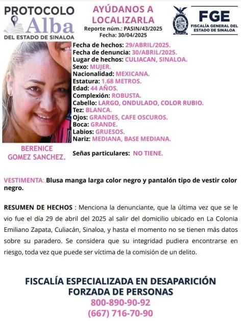CULIACÁN. _ La Fiscalía General del Estado de Sinaloa activó el Protocolo Alba para localizar a Berenice Gómez Sánchez, de 44 años de edad, quien fue vista por última vez el pasado 29 de abril tras salir de su domicilio en la colonia Emiliano Zapata, en Culiacán.