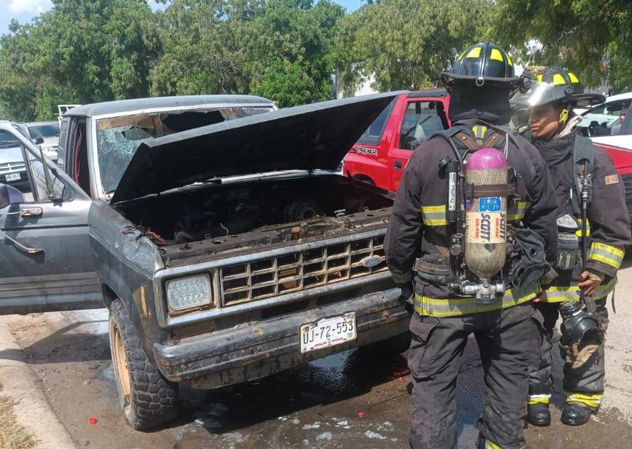 Elementos de Bomberos Veteranos llegaron al lugar del reporte y forzaron el cofre y sofocaron las llamas, que alcanzaron a dañar la zona del motor y el tablero al interior de la cabina de la camioneta
