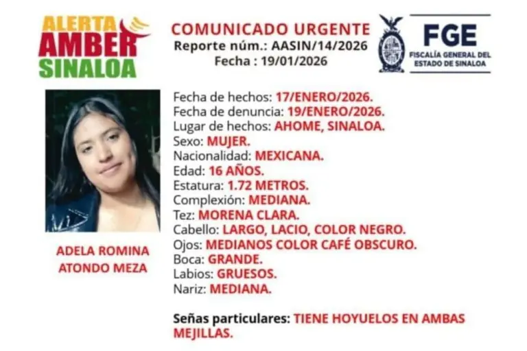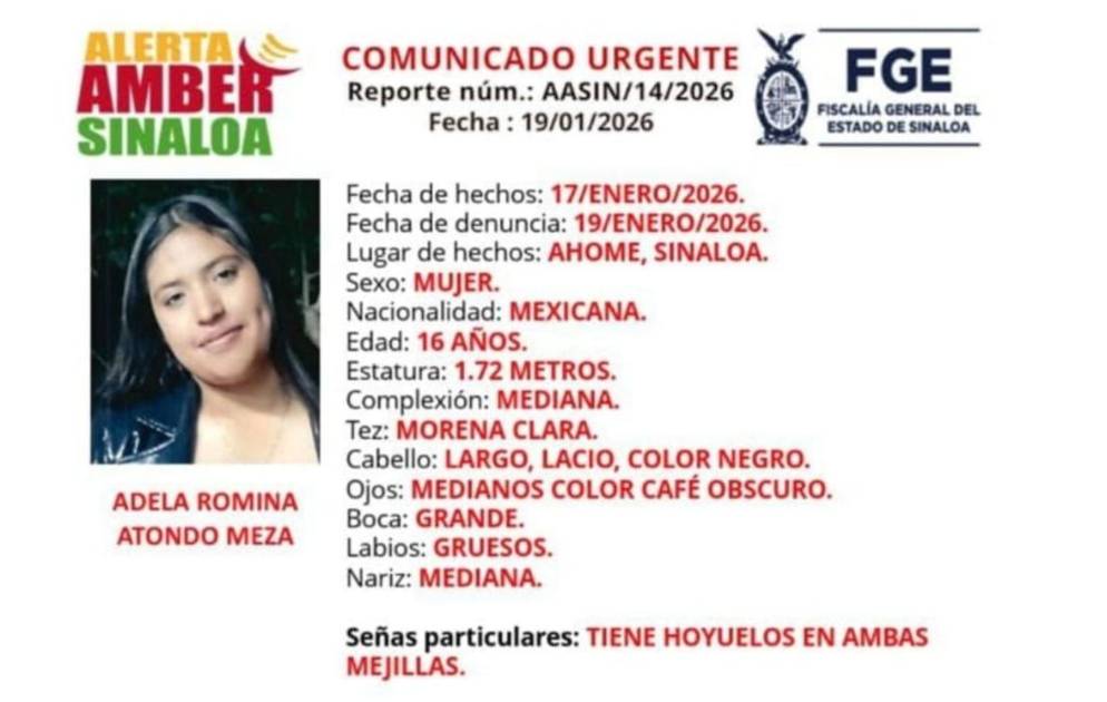 LOS MOCHIS.- La angustia y desesperación invade a una familia del campo pesquero El Colorado pues desde el pasado sábado 17 de enero de 2026, desconocen el paradero de Adelina Romina Atondo Meza, una adolescente de apenas 16 años de edad quien se encuentra en calidad de desaparecida por lo cual las autoridades estatales han desplegado un protocolo de búsqueda inmediato.