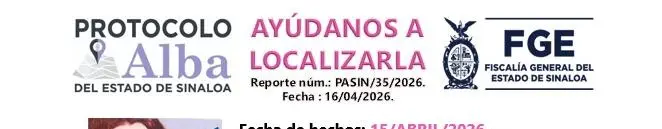 Una agente activa de la Policía Municipal de Navolato fue reportada como desaparecida, por lo que la Fiscalía General del Estado de Sinaloa activó el Protocolo Alba para su localización.