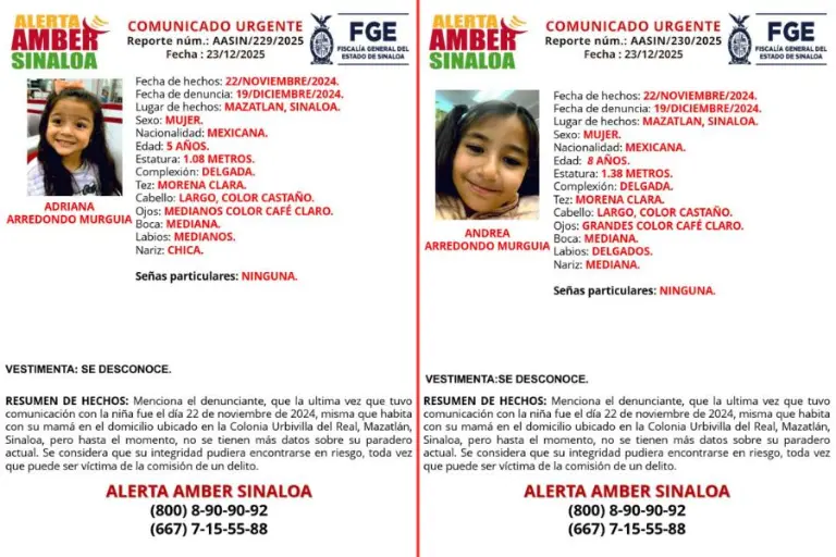De acuerdo con las fichas de búsqueda emitidas, el último contacto que se tuvo con las niñas fue el 22 de noviembre de 2024. Según el resumen de los hechos, ambas habitaban con su madre en un domicilio ubicado en la colonia Urbivilla del Real, en Mazatlán.