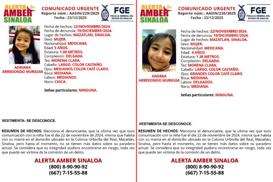 La Fiscalía General del Estado de Sinaloa (FGE) activó los protocolos de Alerta Amber para localizar a las menores Adriana y Andrea Arredondo Murguía, de 5 y 8 años de edad respectivamente, quienes se encuentran desaparecidas desde hace un año en este puerto.
