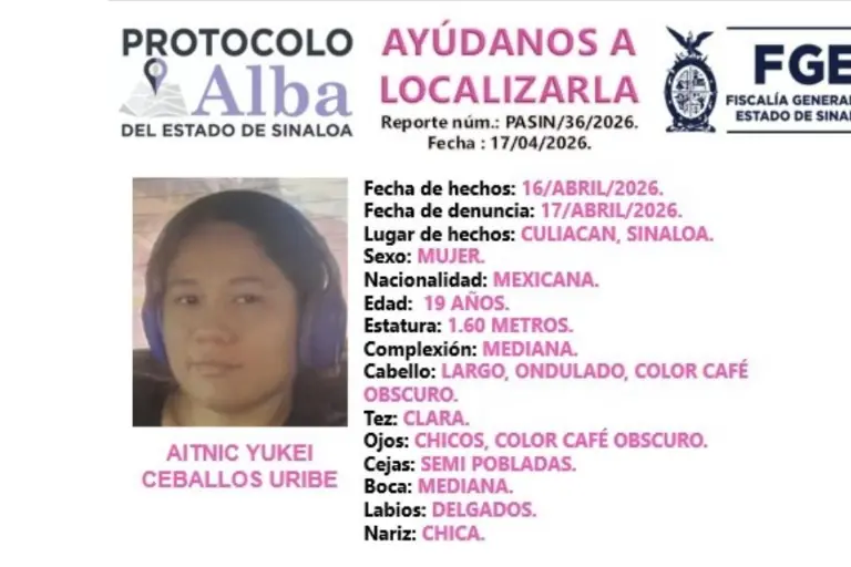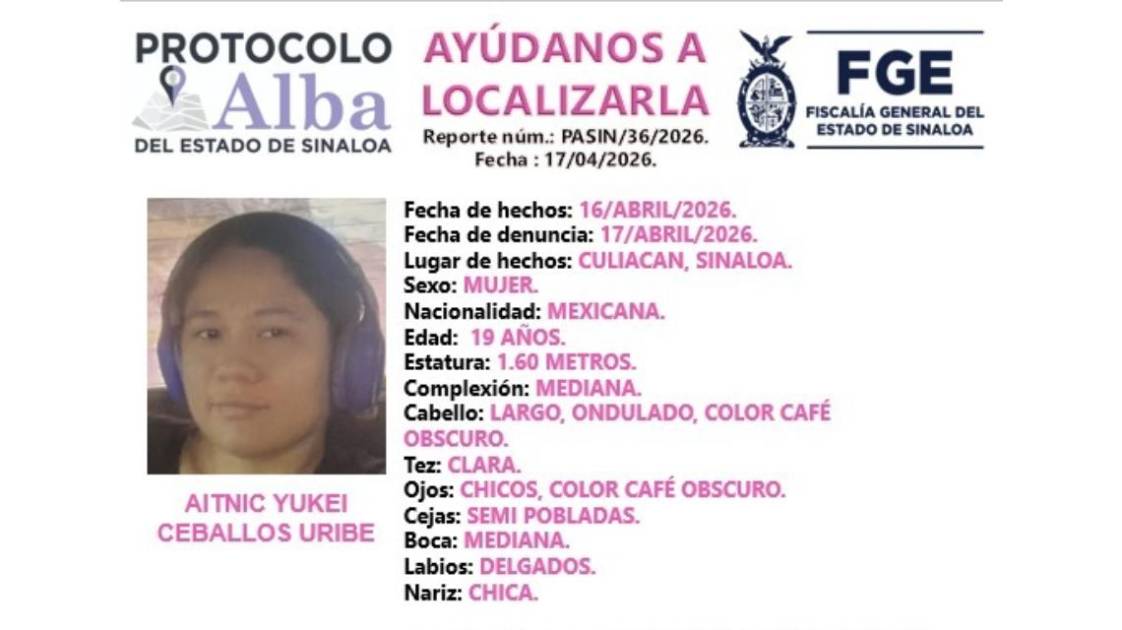 La Fiscalía General del Estado giró una ficha de búsqueda mediante el Protocolo Alba tras la desaparición de la joven Aitnic Yukei Ceballos Uribe, de 19 años, en Culiacán.