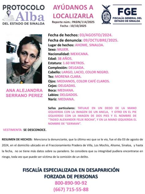 CULIACÁN. _ La Fiscalía General del Estado de Sinaloa (FGE) activó el Protocolo Alba para localizar a Ana Alejandra Serrano Pérez, de 38 años de edad, quien se encuentra en calidad de desaparecida desde agosto de 2024 en el municipio de Ahome.
