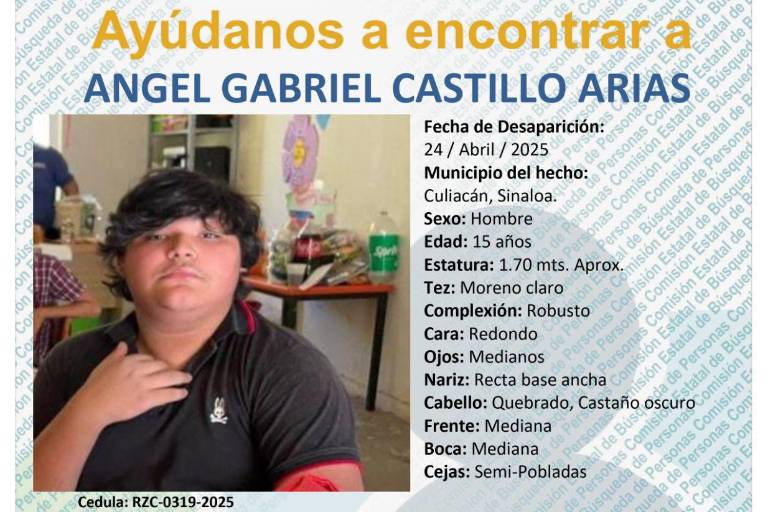 CULIACÁN. _ La Comisión Estatal de Búsqueda de Personas del Estado de Sinaloa emitió una ficha de búsqueda para localizar a Ángel Gabriel Castillo Arias, un joven de 15 años de edad.