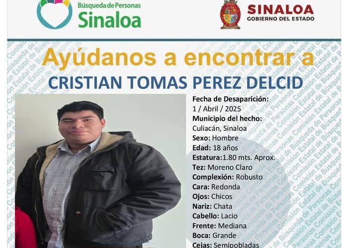 La Comisión Estatal de Búsqueda de Personas de Sinaloa ha emitido una alerta por la desaparición de Cristian Tomás Pérez Delcid, un joven de 18 años que fue visto por última vez el pasado 1 de abril de 2025 en el municipio de Culiacán.