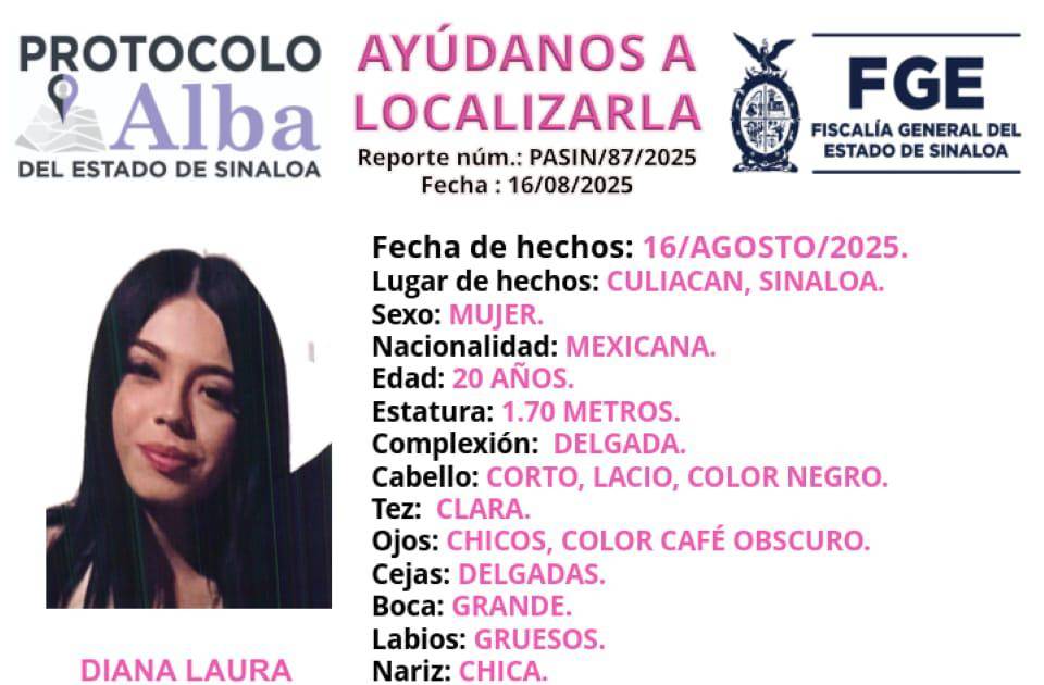 Una ficha de Protocolo Alfa fue activada por la Fiscalía General del Estado para encontrar el paradero de Diana Laura Haros Garay, joven que se encuentra desaparecida en el municipio de Culiacán.