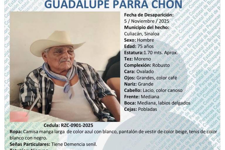 CULIACÁN. _ La Comisión Estatal de Búsqueda de Personas de Sinaloa emitió una ficha de búsqueda de para la localización de Guadalupe Parra Chon, un hombre de 75 años reportado como desaparecido en Culiacán desde el pasado miércoles 5 de noviembre de 2025.