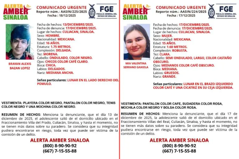 La Fiscalía General del Estado de Sinaloa (FGE) activó dos Alertas Amber tras reportarse la no localización de dos menores de edad en distintos sectores de la capital del estado durante los últimos días.